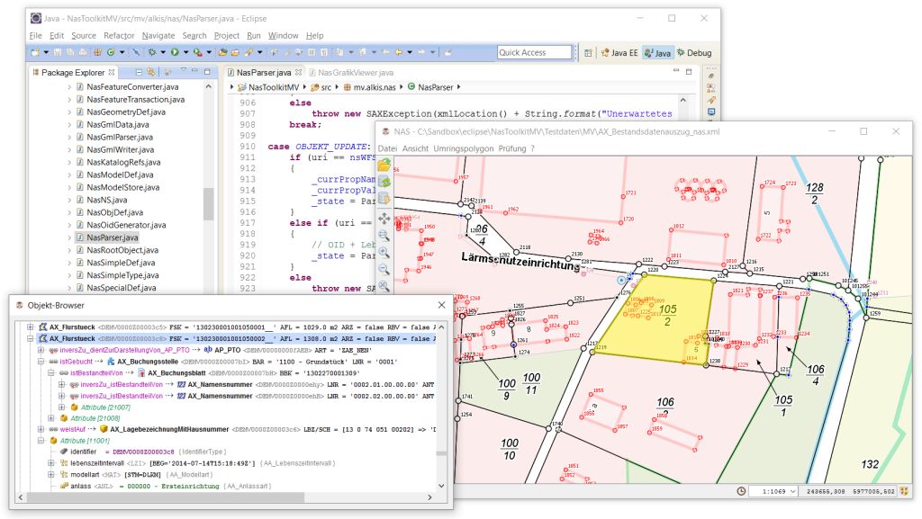 Der NAS-Viewer M-V ist ein Werkzeug zur Darstellung, Analyse, Prüfung und Konvertierung von ALKIS-Daten im NAS-Format. Er wird im Bereich des Liegenschaftskatasters M-V zur Bewältigung verschiedenster Aufgaben eingesetzt. Mit der Implementierung des AAA-Modells hat eine enorm hohe Komplexität Einzug in die Katasterwelt gehalten, die einen sehr hohen Automatisierungsgrad erfordert. In diesem Sinne soll der NAS-Viewer M-V dazu beitragen, den Umgang mit ALKIS-Daten zu erleichtern. Durch die automatisierten Prüfungen, den Objektbrowser und weiteren Funktionen werden die ALKIS-Daten in ihrer vollen Struktur "greifbar".